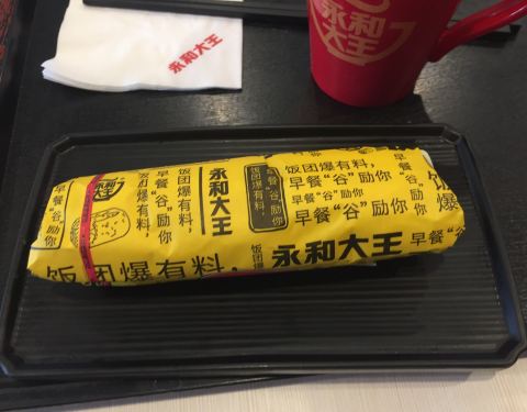 每次来到横店影视城北辰店一般都是中午午休的时候去看场电影,午饭一般都打发一下就可以了,比较多的时候都是从这家永和大王里来买点吃的,一般都是豆浆加上别的,这次尝了个鲜,买了这个糯米棒吃,就是有点甜其他的都很好吃!
