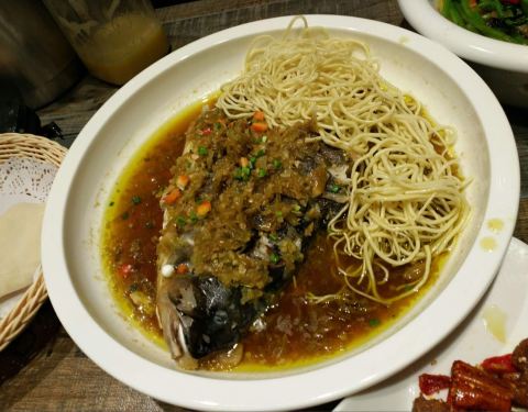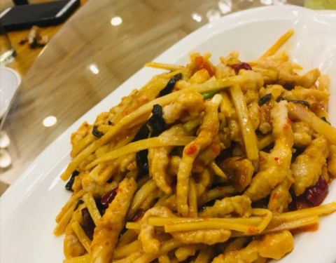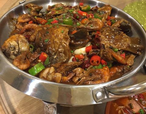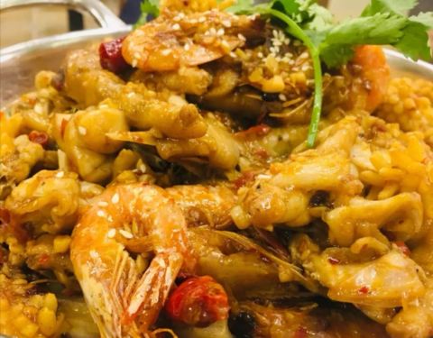一锅鲜,有鸡爪,鱿鱼,基围虾,用蒜蓉炒的,甜甜的,还不错。 鱼香肉丝,不属于传统的味道,带甜味,肉丝较多,下饭吃不错。 排骨,排骨味道很正,很入味。 财鱼汤,很鲜嫩,还不错。