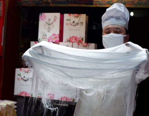 洛阳当地很有特色的一道小吃,丽景门古街上有好几家卖的。其中有一家很正宗,现场制作,你可以看银丝酥制作的全过程,用一块糖拉成6万多根的细丝,然后包裹在牡丹花馅儿的外面。入口即化。送礼必备!