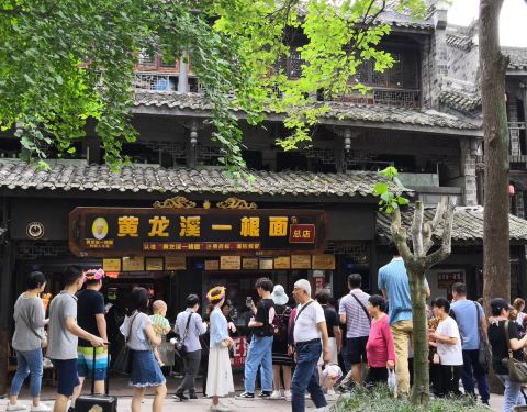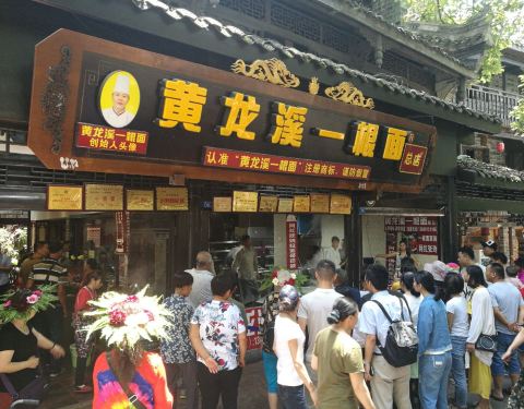 - 买了碗面条尝一下,口味还不错,面的口感也很筋道。在黄龙溪主道上看到了总店,人很多,有人在花式下面
