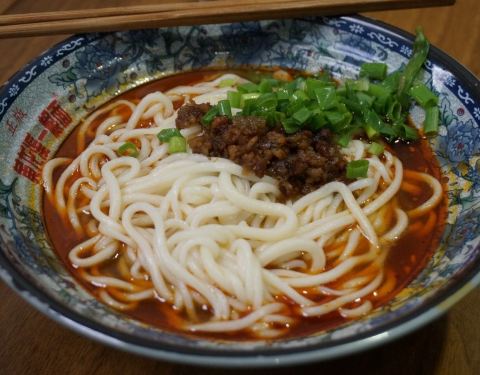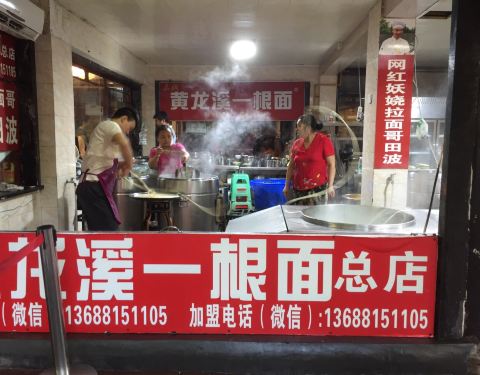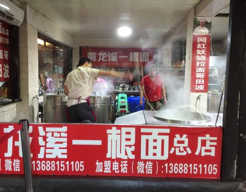 在黄龙溪主道上看到了总店,人很多,有人在花式下面。转了一会儿,在一条支路上见到另一家分店,人少了很多,也有人在花式下面。买了碗面条尝一下,口味还不错,面的口感也很筋道。正吃的时候,赶上拍视频,据说是网红一根面西施,边下面边唱,挺有意思的!