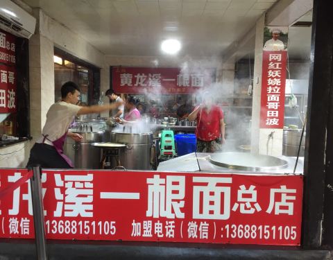 在黄龙溪主道上看到了总店,人很多,有人在花式下面。转了一会儿,在一条支路上见到另一家分店,人少了很多,也有人在花式下面。买了碗面条尝一下,口味还不错,面的口感也很筋道。正吃的时候,赶上拍视频,据说...