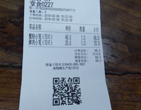 在南翔小笼“博物馆”旁边,私以为是比较正宗的,然而蟹粉小笼很腥,小笼皮厚,但店员说正宗的南翔小笼就是皮厚的~好吧,可能大家现在吃的多了,口味要求高了~ 前往这家店是在四点半左右,店里包小笼的下班了,不知道是不是还有晚餐还是啥的小笼师傅会来,但是非常清晰的看到他们把包好的小笼放冰箱冷冻了~吃完走的时候,有人下单的小笼,看到工作人员拿出一份明显是冰冻住的在翘开……难怪蟹肉会腥了?
