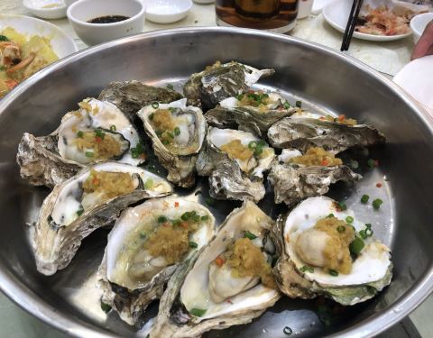 这个花生是甘草味道的。别处还真没吃过,味道很好。20一包,一起来的好多人都买了带回来。我要减肥,像这样开吃了就控制不住,还是免了吧。这家菜味道真不错,海鲜新鲜,做的口味也美。咖喱蟹微辣,整排的糖醋小炸鱼,脆脆的酸甜味的,越吃越爱吃。鸡肉肉质嫩多汁入味。烤生蚝也是鲜嫩的很。最后吃的好饱,还是硬塞进去一个南瓜煎堆。看到好吃的东西,真是胃到用时方恨小!