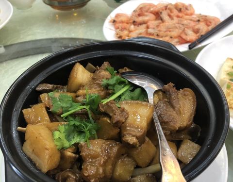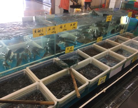 这是酒店一服务生介绍的。虽离酒店有点远,但非常值。酒家很大,食客火爆,我们七点多到,好多海鲜快卖完了,儿子要吃虾,海鲜小子在几个池好不容易找到六只,然后便宜一点😛,值得推荐是云呑,皮薄馅鲜,难怪一路过来都说云呑…
