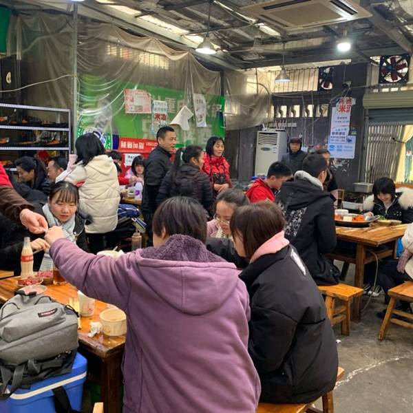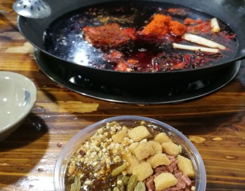 [环境] 店铺隐藏在老旧社区里,店铺是由旧自行车棚改建,毫无环境可言,但确实非常接地气。 中午1点依然火爆,座无虚席。 [服务] 因为人多,服务质量不太行,只有收拾桌子的大爷非常热情,其他服务员大多爱答不理。店墙上挂了很多围裙,可以自行取用,也比较贴心。 「红锅锅底」作为重庆火锅来说不是很辣,味道也不重,不会越吃越咸。 「极品鹅肠」非常好吃,脆爽。 「特色豆干」也强烈推荐,比豆皮口感好太多,也不像豆腐那样容易煮烂。 「午餐肉」说是店家招牌,并不比梅林午餐肉好吃到哪里去。 「鱿鱼」还是很不错的,一下点了两份。 「耗儿鱼」不入味,比鲳鱼口感差。 冬天吃火锅一定要点菜头,非常适合火锅。 总体说来是一家不错的店铺,味道很好,菜品分量也比较实在,没有在碗底垫白菜之类的填充物。
