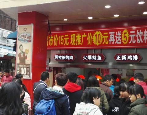 想不到如此火爆!韶关步行街路口这家正新鸡排,貌似搞活动,10元还送5元的饮料,排队人不少,好火爆!看大家吃的过瘾的样子,还是不错的!