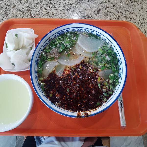 拨开辣子,一口原汤沁润心脾,不愧是兰州,这个汤真的太行了。稍稍的用筷子搅开辣子,汤头的鲜美就被辣子裹的失去了风韵,爱吃辣的我此时更愿意忠于原味,兰州味道,对我而言,稍稍在辣子上有点油腻了。