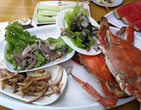 ...一边看大海美景,一边喝美酒,吃海鲜,吹海风,真是惬意极了,不过价格也不便宜,每人人民币200元