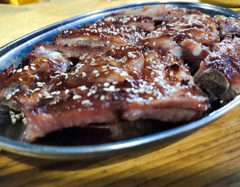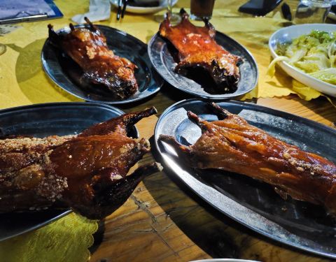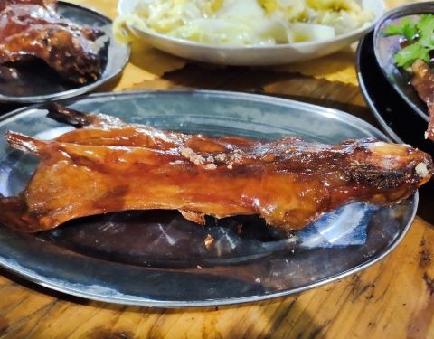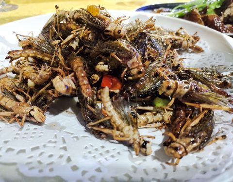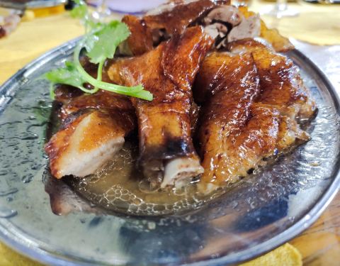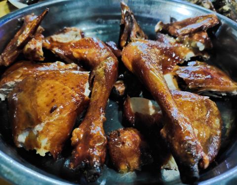 全华美食,番禺的朋友发掘的特色美食,估计某几样招牌菜只有广东人才敢吃,烤田鼠、炸草蜢、桂花蝉,其他地方的朋友听到可能都要打个冷颤吧,餐厅在高架路下面,农庄式的装修,里面有空调,不过更多的食客还是喜欢坐在露天的高架路下面,吃起来更有食欲。 [赞啊]烤田鼠,皮烤的很脆,肉质鲜嫩细腻,强烈推荐,更搞笑的是这个在菜谱上有另外一个名字,叫烤小乳猪,是拿来骗不敢吃鼠的朋友的[偷笑] 烤排骨、烧鹅、烧鸡,同样做的非常美味,排骨不会烤的很干,烧鹅肥美多汁 炸草蜢,蛋白质含量丰富,吃起来口感脆脆的,甘香可口。 炒田螺、青菜,这些小炒锅气够足。 tips:烤田鼠这些招牌菜要早点去点,晚了就没有,我们旁边一桌迟来的就没有点到,专门过来我们这边拍照。