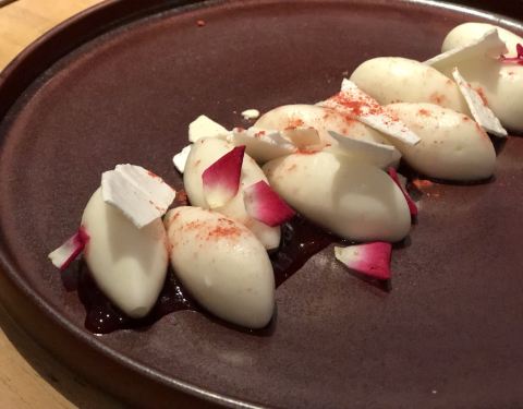 将“春色”常驻于此,菜品也是一改浓油赤酱地本色,篇小清新范儿~即使立夏将至,烈日炎炎,仍能在这栋白色的小别墅里找到几丝春意,甚是心动~店里的装修也是一改本帮菜的古色古香~打造成空间独立感很强的和式感觉~每一个盆栽都是邀请日籍花艺师度身定做的说,立志于打造成这一桌融合本帮菜~ 晴色的夜晚餐厅外霓虹闪烁,坐在户外也是不错的选择哦~每一桌的餐单都是呈现纸质的绳缚放置于餐桌上,等待食客来开启~ 玲珑皮蛋,小清新的本帮菜以凉菜开启~鹌鹑蛋颗颗晶莹剔透腌制成皮蛋的状态~点缀以剁椒,带点鲜味,增加口感,不失为一道极好的开胃凉菜~ 脆片冰激凌山药,将山药打制成绵密的冰激凌口感,有宛如慕斯,撒上蔓越莓美,亦是凉菜亦是甜品,旁边的蛋白饼脆片增加口感,很棒的说,摆盘也很精美。 店里最有名的招牌菜就是这道潮汕水晶冻鱼了,笋壳鱼做底,一改以往烹蒸的手法,而是先蒸后腌再冷藏,使得鱼肉的口感有一种入口即化的感觉~,再点缀上黄豆酱,一口鱼肉下口,黄豆酱提鲜~入口即化的感觉,一口春意融在口中~ 白灼脆猪肝朋友要点的时候,我一开始是拒绝的,因为本身不爱,猪肝自带的内脏气味,但是看排名如此之高,就由得她试试~上桌的猪肝倒是没啥一样,切得也很随意,可一入口就被惊艳到了~酒香满口四溢~盖住了猪肝本有的腥味,原以为看这个色泽猪肝会比较地老没想到,吃到嘴里确实脆嫩的,太神奇了,这个酱汁带点鲜甜,非常地喜欢,下面铺垫的豆芽也很好吃,满口的蛋白质~ 玉米马蹄炖鸡爪,热菜以鲜汤开启,脆甜的玉米马蹄加上鸡爪一起炖煮,这个时节非常地润肺补气,时令好汤~ 龙虾麻婆豆腐,招牌必点,首先这道菜绝对没有看上去那么辣~看似普普通通的麻婆豆腐加上了小龙虾的点缀,按照宫保鸡丁的做法炮制的这道宫保小龙虾,怎能不多下几口饭? 荷香腊味蒸鸡,鸡肉的菜品本身就是我的大爱,加上腊肉和荷叶的点缀,清香了不少,仿佛乡间的野趣~回味不已~ 原味烧仔排,用梅干菜烧汁,我的最爱,选用的梅干菜很清香,提升了不少鲜度~仔排选用的肉的部位也很好,精肉为多,却炖得酥烂~ 乡村石锅豆腐,最爱老豆腐的石墨香以及那浓醇的汤头啦~咸肉吊鲜,春意满满~ 自制腊肉炒花生苗,好一道特别地素菜,花生苗外面不多见~鲜汁脆甜~ 主食一道简简单单的开阳葱油拌面,却让我感受到,哦~实实在在的本帮口味~ 甜品一改以往的酒酿小圆子,来道特别地十年陈皮红豆沙,陈皮的香久久不能