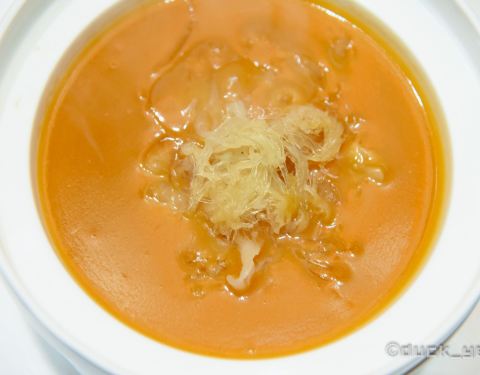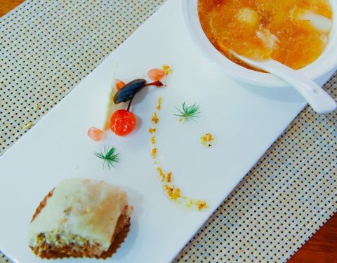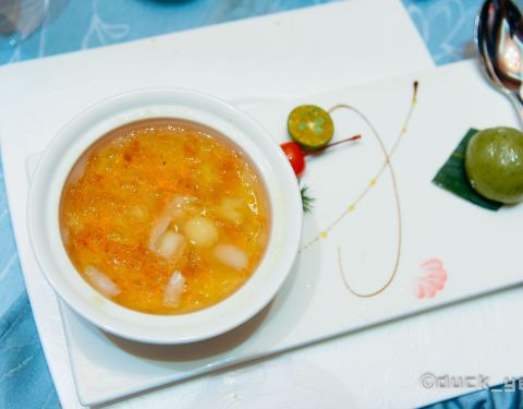 周末有事没事来漳州溜个弯,实在是好喜欢这个小县城,仍然是入住佰翔圆山酒店,晚上懒得出去便在酒店的中餐厅用餐。 [环境] 位于酒店2楼,有包房也有大厅,喜欢大厅独具一格的倒扣碗吊灯,非常中式复古! 菜品主打闽菜和粤菜 鲜果脆米沙拉,作为开胃沙拉,脆米搭配鲜果的创意可以打满分,里面有芒果粒、哈密瓜、苹果等等,貌似还吃到了三文鱼籽。很清爽! 石锅海参卤肉饭,按位上,石锅保温加热,里面有一大片肥瘦相间的红烧卤肉,海参是切成细长条,整个米饭被汤汁浸泡,食用之前最好再拌一拌。米饭吸收了海参和卤肉的香味,胶原蛋白满满。 金盏碧绿牛仔粒,摆盘很有创意,牛仔粒、腰果盛装在脆薯格里。牛肉肉质不错! 萝卜丝烧带鱼,清甜的萝卜跟鲜美的带鱼结合,也是一道比较家常的做法,特别爱底下的汤汁,回甘无比。 功夫野生松茸炖花胶,这道汤是用一把茶壶呈上桌,有点类似日式土瓶蒸的感觉。野生松茸片、花胶都是好东西,炖出来的汤滋阴补气。 家烧佛手菜,清甜的佛手菜加入了三层肉片,更香了! 红糖麻薯配莲子桃胶,每次来必点的,莲子桃胶炖的恰到好处,在冷热交替的季节吃最好!红糖麻薯皮特别Q [服务] 五星酒店的服务自不必多说,勤换骨碟,倒茶水。无论是请客还是自己吃都是不错的选择!