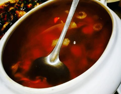 跟着老妈混吃混喝[第三辑,买的是团购的4人餐,感觉特别划得来了。菜挺多的 。一个凉菜,3个热菜,一个蒸盆子 。还有汤,主食有白米饭和锅盔辣子,4个人是足够吃的。他家整体味道挺好的,比较喜欢腊肉炒耙耙,很喜欢耙耙的嚼劲,有点像炒饼里的饼。烤鸭的皮超级酥脆,配梅子酱非常美味。觉得锅盔辣子里地锅盔有点硬,并且里面比较虚,不是很推荐。