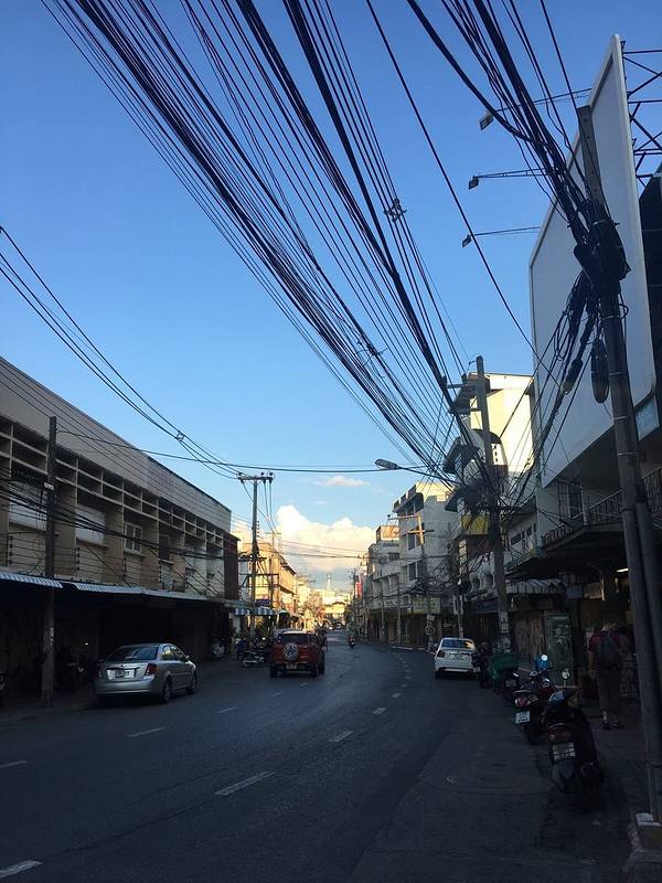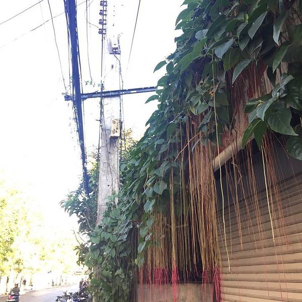 蝶豆花没有任何味道,饮料就是糖水。面条有淡淡的咸味,猪肉也很嫩,很惊喜。很多店会用这种气生根装饰,下面是鲜嫩的粉红色,上面是黄色,很好看。阳光明媚的远方街道脏乱的恰到好处,想起梁博的日落大道,那种公路和阳光带来的迷惘