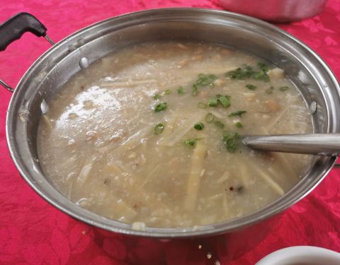 这里是吃农家菜的,但最出名的是沙口笋,沙口笋是国宴上用的笋,其爽口清甜无渣是特点。今天中午点了鲜笋花生鱼蓉粥,顾名思义,就是用鲜笋花生和鱼蓉做的粥,最重要的是放了一些田螺肉,使粥更清甜和有嚼头。这...