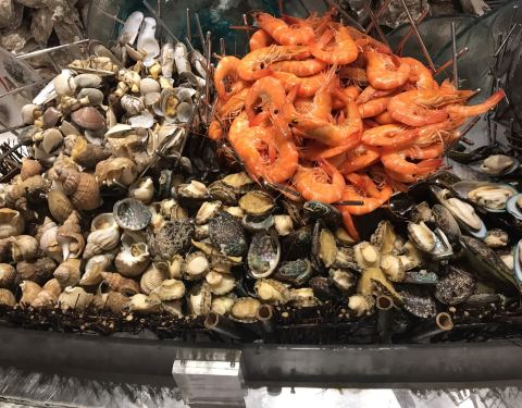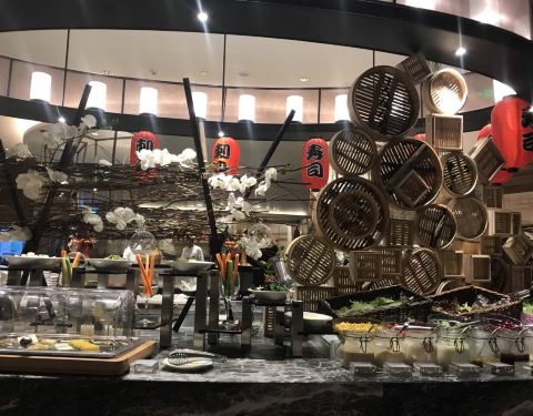 环境还是很不错,要提前预定座位,但也没想象中人多,整个就餐环境也很舒适,烤生蚝每次只取三个,但也不排队,味道还是可以,酒店自助餐都是中规中矩的。带小孩一路,三岁以下免费,三岁以上129元,君豪收全价,太不科学,果断选择了喜来登。