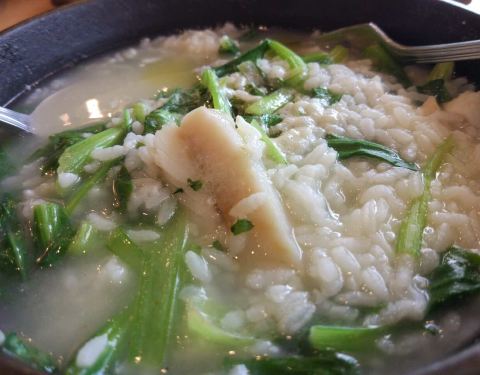 宝宝最爱喝玉米浓汤,味道甜中带一点点咸,很好喝。尤利鱼的这个菜泡饭不好吃,鱿鱼烤过了,有点苦