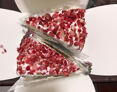 去的时候人很多所以东西比较新鲜哦!可能是支付宝五折活动,和朋友一起买走了它家最后3个上面铺了一层草莓干的小蛋糕。希望味道让人惊喜!