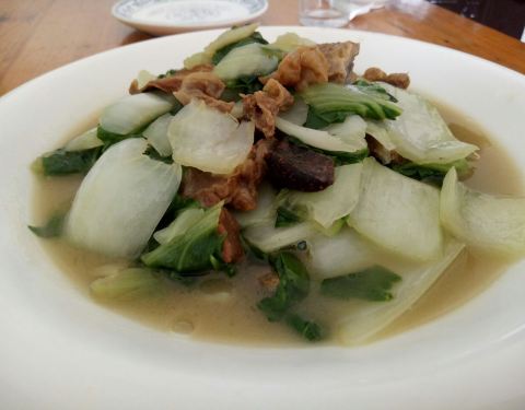 跟朋友一起过来吃的农家土菜,位置不太好找,东善桥霞辉庙社区,路边有指示牌,进来后又走了一段才找到。前面是店家自己住的小楼和厨房,墙上有简易的菜单板,后面是休闲吃饭的地方。有水有小亭有果树有露天的休闲桌椅还有菜地,天气暖和的季节来应该还不错。 三个人点了4个菜:菜量实在价格也不贵。青菜油渣:自家炼的油渣很香,青菜也是自家菜地种的。酸萝卜肚肺煲:天冷要吃点热汤带水的,酸萝卜很开胃,肚肺处理的也很干净,软烂适中,汤头浓郁,狠下饭。
