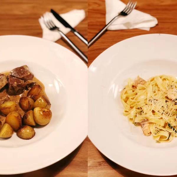 尽管过去走路就10分钟不到,但是中间雨又下大了! 我居然把伞放在行李箱里???蛋糕看起来都超级好吃!最后点了拿破仑+黑森林泡芙。土豆牛肉,土豆有点甜。意面中规中矩。汉堡不错,拿破仑也不错,但是感觉叶卡...