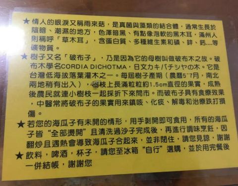 吃海鲜的好地方,早点去还不需要等位,到了7点左右,那个人多得不像话了,三杯鸡味道很好,虾的个头很大,很生猛,炸大肠清洗得干净,没有那种骚味,很脆,情人的眼泪很好听,其实是一种海菜和鸡蛋一起煮,味道不错,份量很大,实惠,强烈推荐。