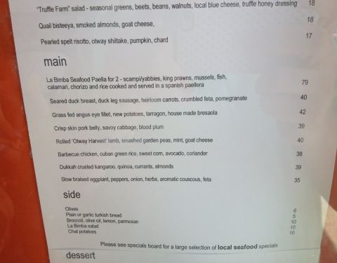 这是一家澳大利亚菜餐厅,是airbnb的host推荐给我们的。这里的氛围很好,适合约会/正餐,也有不错的酒。我们看到菜单上有袋鼠肉,出于猎奇,还点了一份,味道有点像羊肉和牛肉的混合体。可能是因为去晚了,服务稍微有点慢。