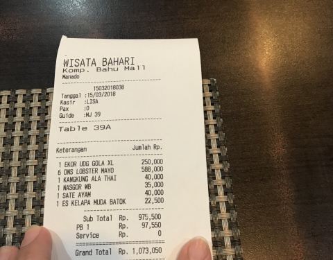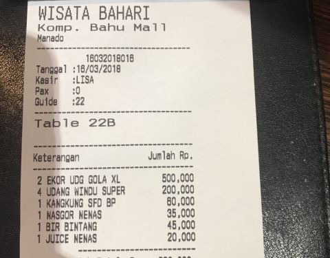 这家餐厅起初的时候真的是不错的,有几道海鲜的菜做的非常不错,比如印尼帝王蟹就做的很有美娜多特色,价格也公道,没人平均消费大概在80至120人民币左右,但是至2016年下半年以后,中国游客开始增多,很多导游和这家餐厅提出要求,索取高额的回扣,现在至下午时段基本是中国游客在内,已经失去了当年的宁静与单纯,菜式也越来越一般,特别提示游客,如果非要去这家餐厅的话,千万不要以为报导游的名字会打折,这样只会大大增加您的就餐成本,相信有一天,餐馆老板会拒绝和黑心导游及旅行社合作,恢复以前的纯净。