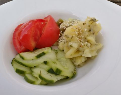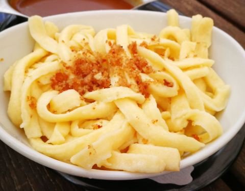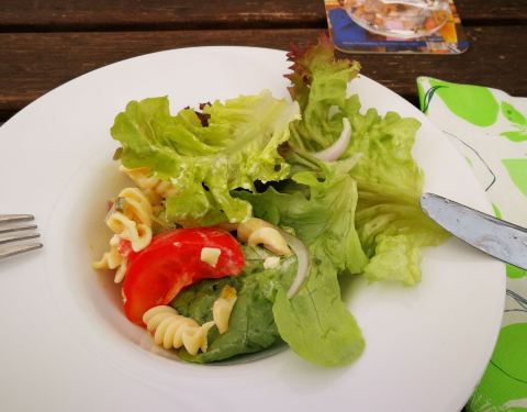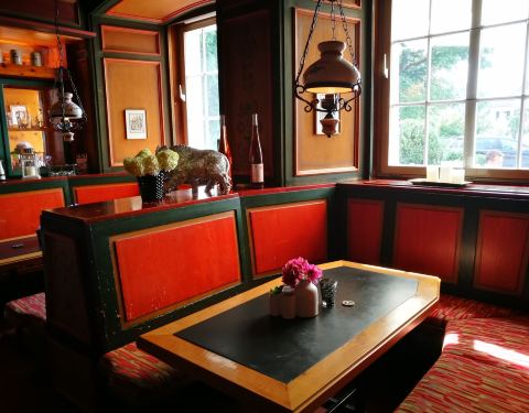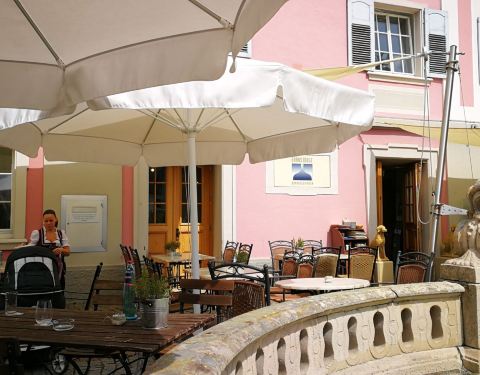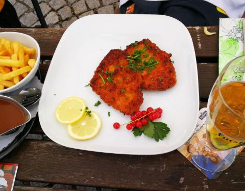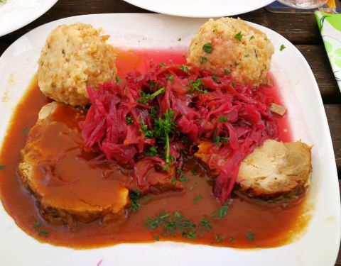 餐厅旁有专用的车位,但是开车进镇时不容易看到,等开到餐厅门口则停车位已经过了,算了就在啤酒厂门口附近找个位置停车,反正坐在室外喝啤酒看得见。餐厅非常大,室内浓重的乡村氛围,墙上挂着许多老照片,还不时有一群群打着小红旗穿着黄马甲参观服的德国老头老太,集体参观啤酒厂后在这里购买纪念品。菜则比较凶猛,黑森林的地方菜,猪排、猪手都来上一点,配上刚刚出厂的生啤,坐在阳光下泉水旁,真是生活