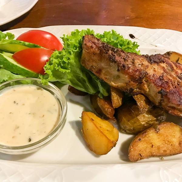 鸡肉蔬菜 沙拉 真的好吃!同样也在胜利广场上,当之无愧的美食聚集地。猪排,味道还算说得过去