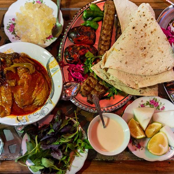 网红店,餐厅从墙壁到天花板都装饰着各种灯具等装饰品,就是位置不是特别好找,不过就在巴扎周围,千万别跟着导航走。 【价格】人均20万 IRR人山人海,还是需要等位置先找个“3人桌”坐下,小伙伴们点菜时也是吸引了旁边的伊朗小哥。在个性的装潢下,用餐的当地人升级到大桌子炖茄子真的很棒。而且,第一餐我就爱上了当地的酸奶。