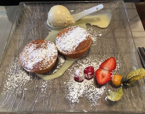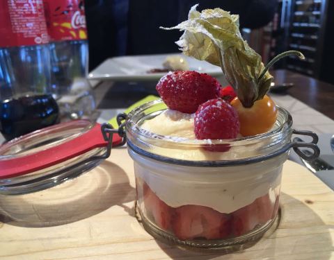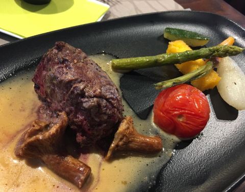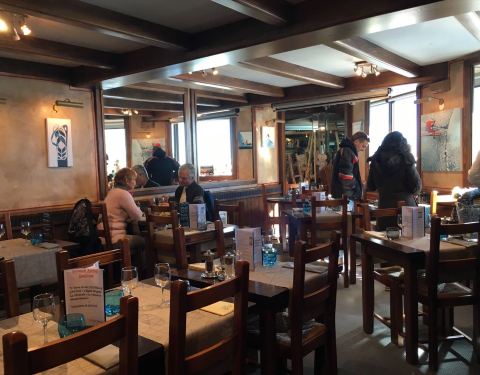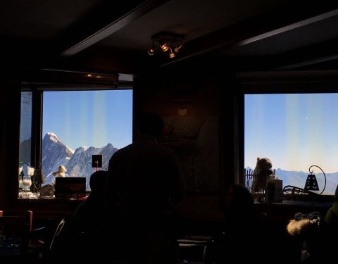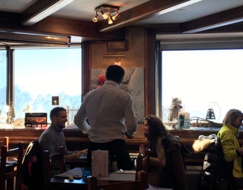 南针峰山顶上的观景餐厅,中午12点才开,估计2点就停止接待了,就一个大叔兼顾整个餐厅的前台服务,大概只有10张桌子,大叔会完全服务完一桌再继续下一桌,很认真,最便宜的是主菜加甜品,一位32欧,可以有4种不同的主菜选择,我选了鹿肉,味道比牛肉更好,甜品是草莓慕斯也是很好吃,窗外还可以看雪景,一流环境一流服务一流食物。
