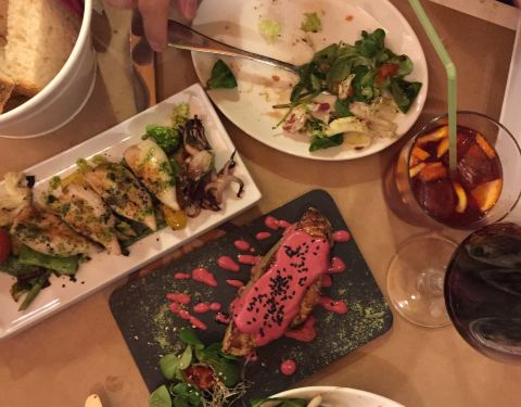 这家在中国游客的眼中已经是非常网红的一家店了!不 过说实话这家附近的店口味、价格和人气都和它差不 多。只是因为这里店小上菜慢,所以感觉一直都爆满一 样。主要是旁边的店都太大了,但是全都坐满了各国 人。...这家在中国游客的眼中已经是非常网红的一家店了!不 过说实话这家附近的店口味、价格和人气都和它差不 多。只是因为这里店小上菜慢,所以感觉一直都爆满一 样。主要是旁边的店都太大了,但是全都坐满了各国 人。这一家就太小了,能容纳30个人左右吧,上菜还特 别慢。 不过这家店的菜品和价格也都还不错,至少是不会踩雷 的。 点了图1的牛肉和图2的猪肉,感觉猪肉更好吃,图3的类 似于汉堡但没有面包的东西也不错,推荐;图4的泰式饭 还行。啤酒和调酒如图5,前面这个有柠檬的好像是巴塞 罗那很出名的一款调酒,经过每一家餐厅都看见有人在 喝,味道还不错,适合女孩子。