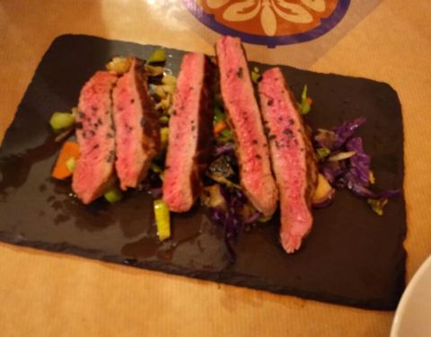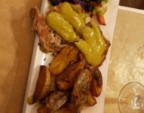 店门口放了今日菜单,非常可爱的用粉笔画了各种 食材,刚进店的时候在吧台等位了很久(非常不建议坐在那儿,气味比较重)后来换到了小餐桌上。 推荐他们店里的伊比利亚烤猪肉。此行最佳猪肉料理,焦香!弹牙! 茄子馅饼口味很中国茄盒~ 另外印象比较深刻的是甜点:巧克力味的奶冻,上面轻轻的放了一枚姑娘果~口味很清淡,甜度刚好 本次人均:约16欧