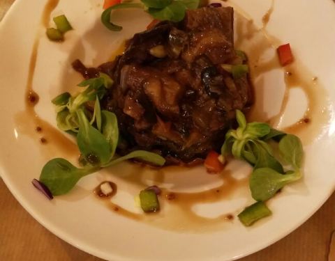 店门口放了今日菜单,非常可爱的用粉笔画了各种 食材,刚进店的时候在吧台等位了很久(非常不建议坐在那儿,气味比较重)后来换到了小餐桌上。 推荐他们店里的伊比利亚烤猪肉。此行最佳猪肉料理,焦香!弹牙! 茄...店门口放了今日菜单,非常可爱的用粉笔画了各种 食材,刚进店的时候在吧台等位了很久(非常不建议坐在那儿,气味比较重)后来换到了小餐桌上。 推荐他们店里的伊比利亚烤猪肉。此行最佳猪肉料理,焦香!弹牙! 茄子馅饼口味很中国茄盒~ 另外印象比较深刻的是甜点:巧克力味的奶冻,上面轻轻的放了一枚姑娘果~口味很清淡,甜度刚好 本次人均:约16欧