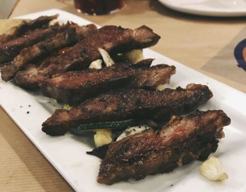 店门口放了今日菜单,非常可爱的用粉笔画了各种 食材,刚进店的时候在吧台等位了很久(非常不建议坐在那儿,气味比较重)后来换到了小餐桌上。 推荐他们店里的伊比利亚烤猪肉。此行最佳猪肉料理,焦香!弹牙! 茄...