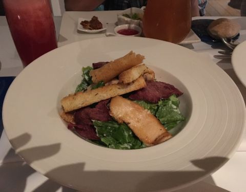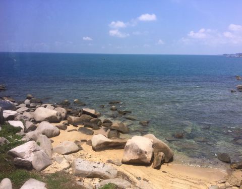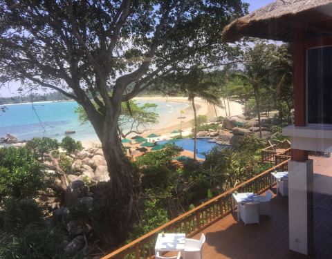 景色不错,有海景,厕所有点旧。工作人员很热情。在大门可以让酒店的车送到餐厅,包接送电瓶车。户外有桌子,不过晒,靠近沙滩和游泳池。