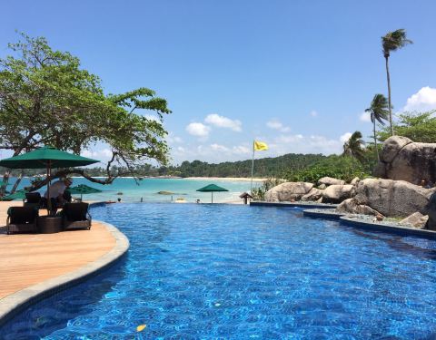 景色不错,有海景,厕所有点旧。户外有桌子,不过晒,靠近沙滩和游泳池。工作人员很热情