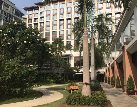 团队游回国那一天安排来香格里拉吃了一个下午茶。因为东南亚比较潮湿,所以酒店的大堂都在二楼。下午茶在大堂的咖啡厅,门外还有一个花园,有空的可以去逛逛。下午茶包括椰子饼,黑森林蛋糕,芒果布丁,沙爹鸡肉串等,饮料柠檬茶,泰式奶茶,咖啡畅喝,总之不错的体验。