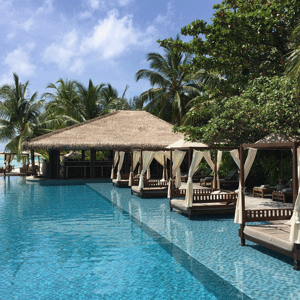 工作了一上午,是时候去祭祭五脏庙!岛上共有3家餐厅2个酒吧,全都在一价全包范围内。小黑把我们带到主餐厅(The Dining Room)吃自助餐,这里从到早晚都营业,提供自助餐或者点餐,菜系很多,包括东南亚菜、意大利菜、墨西哥菜、马代菜等。价格也是岛上最划算的。饭毕四处走走,恰好海滩酒吧(The Beach Bar)距离主餐厅才几步路的距离,顺便去晒晒太阳消消食。这里是一个餐吧,位于主泳池隔壁,一价全包的客人可在此品尝午餐(点2-3道菜)。我看了下菜单(菜式挺少的),以西餐和小吃为主,三文治、汉堡、甜品之类。池畔酒吧景色瑞喜敦的酒吧都很早开门(10点半),下午恰好没安排,就把图书馆吧(The Library Bar)一并考察了:这间吧毗邻酒店大堂,除了鸡尾酒和小吃之外,还可以在这里玩玩台球和国际象棋消磨时光。下午,服务人员问我们要不要去附近的荒岛玩,我忙不迭答应了。还以为要搭多尼船,没想到就在和迪鼓拉岛相连的栈桥旁边,划着皮划艇就过去了,真方便!这片小沙洲头尾都是拖尾沙滩,看我拍得不错吧!我们预约了第二天晚上的水上餐厅(The Falhuma)的座位。这里是岛上位置、环境最好的餐厅,位于栈桥尽头,可以一边吃饭一边欣赏海景。西餐很精致,可惜价格也不便宜,一价全包只能抵扣$50-70的额度,其余要自付,如果按照三道菜的流程走下来,这点额度是绝对不够的。第一天就在看房和胡吃海喝中过去,第二天习惯相对宽松,有很多活动可以免费参加,我决定探索一下岛屿周边的浮潜环境。