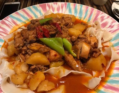 虹口曲阳的一家新疆餐厅 服务员身着传统服饰载歌载舞 『烤羊排』¥129 个人觉得蘸辣椒粉更棒 不过对羊肉过敏的我 还是觉得有股膻味 『大盘鸡』¥128 用的是草原土鸡 自然肉质就紧致多了 有点老 有配玉米哦 不过太硬 用甜玉米会更好的 汤汁有点少 以致面条都浸没不到 个人觉得大盘鸡 还是古法的好 性价比也高 『天山馕包肉』¥48 馕很香诶 吃口蓬松 蘸着酱 挺不错的