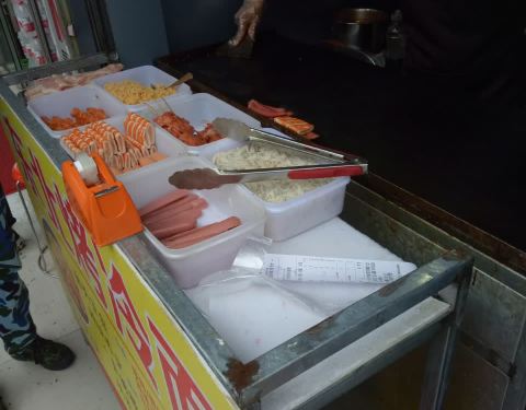这种烤冷面的小摊位也非常多 看着人气蛮旺的 就去买一份吃吃看 料可以根据个人的喜好 添加 我们加了份培根 烤冷面里本来就会加一个鸡蛋的哟 看着烤冷面新鲜出炉的 有番茄酱大味道诶 貌似没有我在青岛的时候好吃