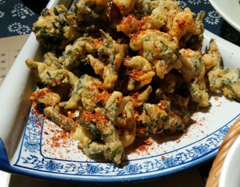 搜网友攻略发现这家店。位置不是太好找,在韩城新天地的斜对角,小小的院落,被座椅和花花草草塞得满满当当。有民宿,两百多一间,不知道如何。三色小馄饨,皮厚肉少。韩城页面,味道很怪异。三舍一口香,咸香,还行,就是等的时间比较长。炸花椒叶,鲜美,有刺但是都炸酥了。卫生有待加强,苍蝇呀。