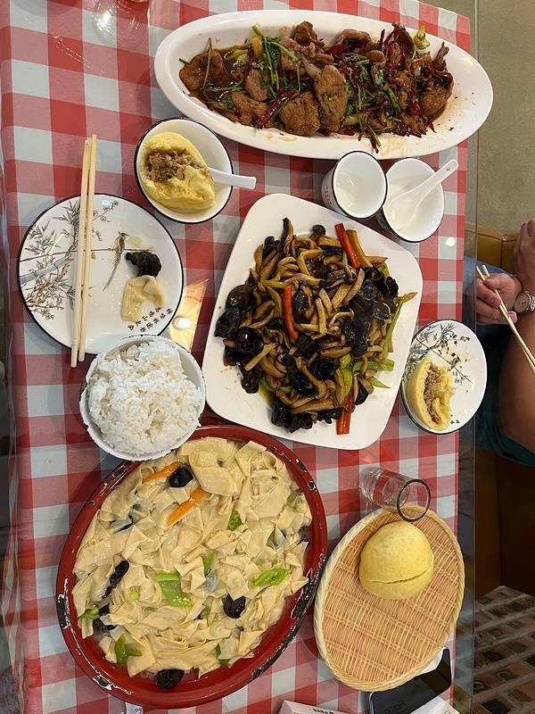 回来搜了一个评价比较高的店去吃了晚饭,只能说有些失望,菜码大的离谱,作为一个北方人,也不是很理解。点了3个菜,2个菜团子,然后一碗米饭,花费110左右,价格还比较实惠。盘子大的离谱牛肉太嫩了,怪怪的。干豆腐很薄,还不错,糊挂的太厚了。森林小炒我记得网上的图有野菜来着,我这一盘全是蘑菇,味道一般。菜团子很不错。