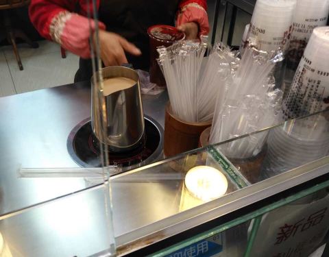 原味奶茶是事先煮好的,一大桶,有客人点餐后店里的小伙儿会用竹制的舀子从桶里舀出奶茶倒进杯子里,然后依客人要求加料后封口,很快很快就做好一杯奶茶!味道还不错的,有点融合了台式奶茶和港式奶茶的味道,微苦带甜,我还挺喜欢这个味道的^_^ 而且价格好便宜啊!一大杯主要5块钱!5块钱你买不了吃亏也买不了上当,走过路过可以买一杯尝尝哟^_^
