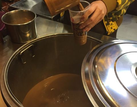 一大桶,有客人点餐后店里的小伙儿会用竹制的舀子从桶里舀出奶茶倒进杯子里,然后依客人要求加料后封...
