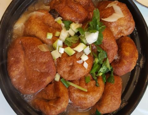 - 好像是旅游团的定点餐厅,饭点儿有许多大巴车旅游团来吃团餐,大厅比较大,吃了本地著名的过油肉,口味很正