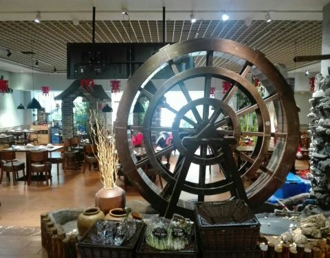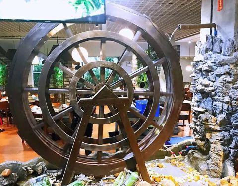 德尚煌.六艺领鲜顺德菜(四季天地店)位于赤岗北路118号四季天地首层,虽然附近有地铁三号线广州塔站和公交车赤岗路口站,但是也要步行十几分钟,交通不算方便。 朋友中了德尚煌.六艺领鲜顺德菜(四季天地店)的三人霸王餐,约我晚上过去消费。 这家的门面较大气,门前的LED反复在播放连山食品供应基地的录像片。一进餐厅门口,就见到了一部小型的水车,水车旁还展示了很多新鲜瓜果蔬菜等。店面装修的很有特色,突出了顺德特色。 【盐炊连山土鸡】鸡不很大只,鸡肉结实,鸡味浓郁。 【清炒连山菜心】菜心很嫩,非常清甜。 【顺德鱼塘公焖鱼】鱼很大条,先煎后焖,非常鲜甜。汤汁拿来捞饭正好。