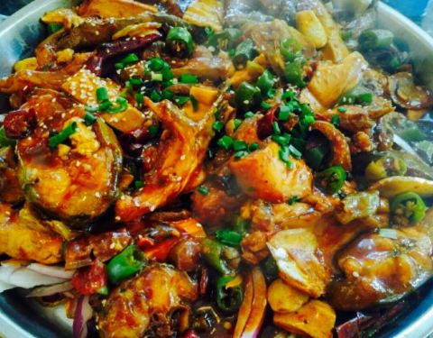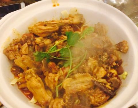 万松园路上的美食之一,好像是荆州那边的可口。就是一种鸡肉的做法。25块钱一斤,一般的鸡都很大,一份大概都有3斤多,成品累似火锅,厚厚一层油,鸡肉炖的很烂,很爽口,卤料香浓,肉质肥美。应该还是比较不错的选择。只是不太适合2个人去吃,毕竟3斤多的鸡,只吃这个就饱了。干子炒肚片,味道还不错,尤其是那个干子,卤味十足。其它菜式一般,没什么深刻印象了。去的时候一般都是又位置的,不用等,但是夏天的时候,吃龙虾的多,对面的巴厘龙虾很火爆的,这边相对人少很多。但是停车都一样的痛苦。