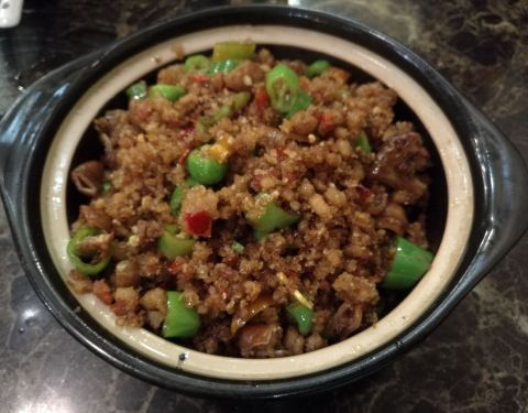 一个人吃一只鸡是什么觉得。招牌菜,活鸡现杀现做现吃,肯定要品尝吧。首先,上菜很快,赞一个。量很大,一个人面对,无奈,谁叫你馋呢。味道真的不错,肉很嫰滑,不错。各种部件都全了,的确是一整只鸡。最开心的是里面的大蒜头,又香又烂,还很鲜美。