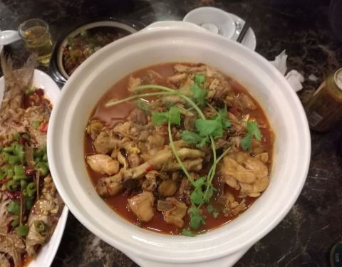 一个人吃一只鸡是什么觉得。招牌菜,活鸡现杀现做现吃,肯定要品尝吧。首先,上菜很快,赞一个。量很大,一个人面对,无奈,谁叫你馋呢。味道真的不错,肉很嫰滑,不错。各种部件都全了,的确是一整只鸡。最开心...